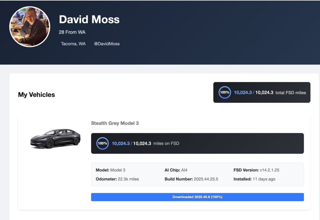 在用FSD开了4397.4公里横跨美国东西海岸的同时,David的FSD的行驶里程也已经超10000英里(大约16093.44公里),且是100%自动驾驶。