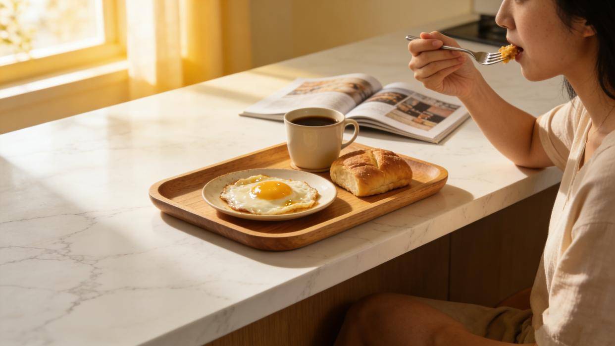 ①早餐台:工作日的早上,时间紧张,中岛台就可以作为便捷的早餐台。在这里吃早餐,不用特意摆餐具,吃完收拾碗筷也极其方便,吃完餐具转身就放入厨房水槽,一切在几分钟内高效完成,节省大量通勤时间。