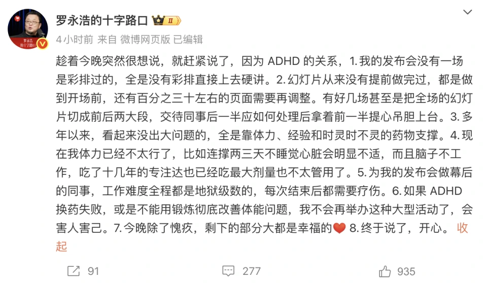 到了12月31日凌晨2时27分,罗永浩在个人微博发布了一篇长文,自曝患病十几年。他解释称,自己患有ADHD(注意缺陷多动障碍),这是导致发布会出现问题的原因之一。